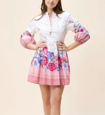 A playful mini dress adorned with a whimsical bohemian patchwork print in soft pink, orange, and blue tones. The tie-front neckline, three-quarter bishop sleeves, and ruffled hem create a relaxed, romantic silhouette, perfect for festivals or vacation wear.