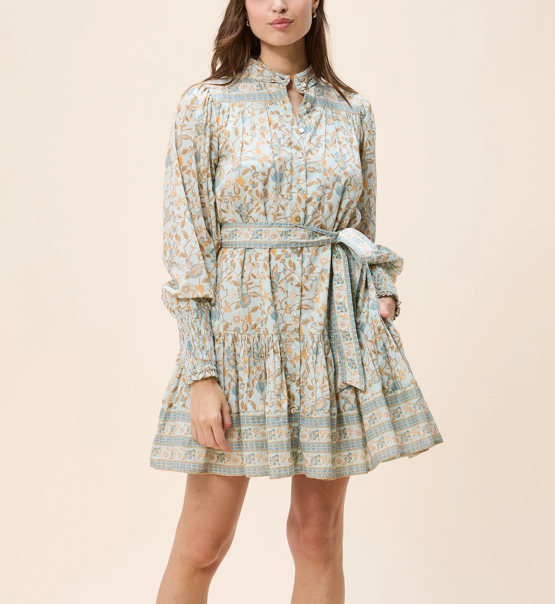 Sky Blue Floral Print Tie-Waist Mini Dress