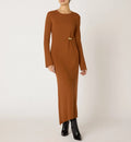 A figure-hugging maxi dress crafted from soft rib-knit fabric in a warm caramel hue. The twist-front detail with a gold-tone metal accent adds subtle elegance, while the long sleeves and floor-grazing length create a sophisticated silhouette perfect for cooler days.
