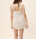 A bohemian-inspired mini dress featuring intricate hand-crocheted circular patterns and a scalloped hem. The slim spaghetti straps and relaxed shift silhouette offer effortless style, making it perfect as a beach cover-up or for layered summer looks.